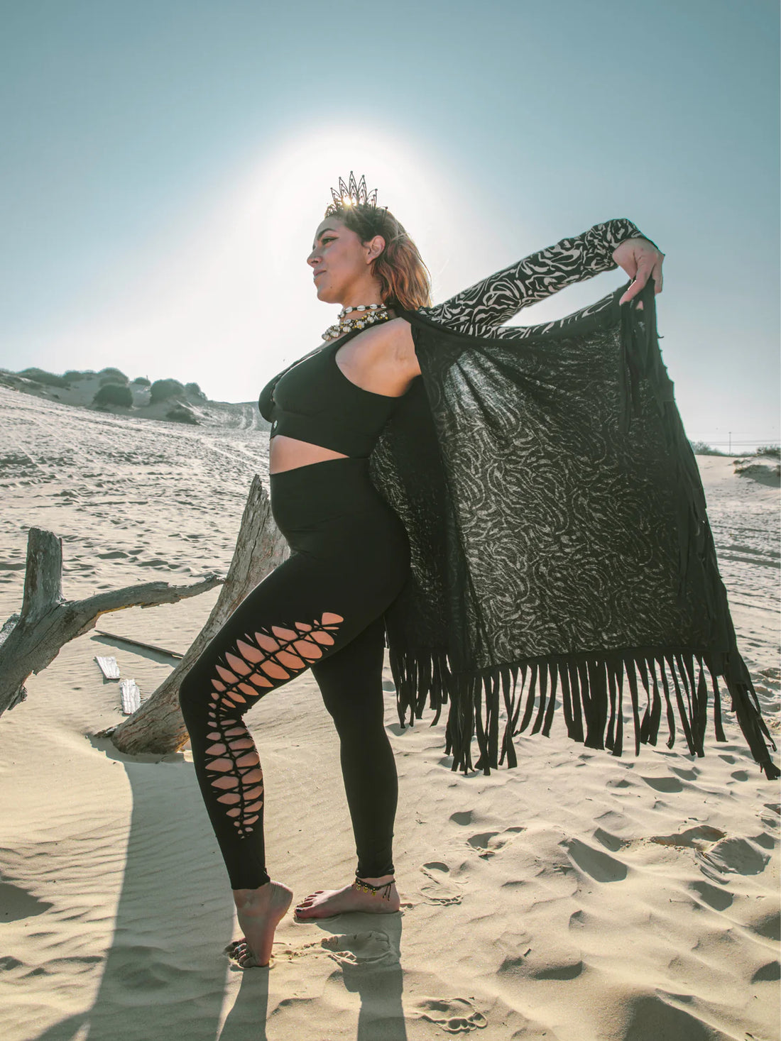 These beautiful leggings are made to move with you. On the side of the leg, there is a decoration of cuts & knot who give the legging its exclusive look. The waistband is flexible, the fabric is soft and stretchy, and the length is long enough to scrunch around your ankles or pull over your heels.